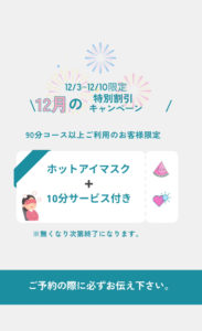 ホットアイマスク+10分サービスを無料でプレゼントいたします。